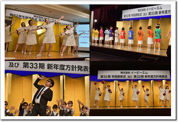 新年度のはじまりに、各店舗の方針発表を身体を使って発表します!チームワークと店舗の個性が発揮される場です。